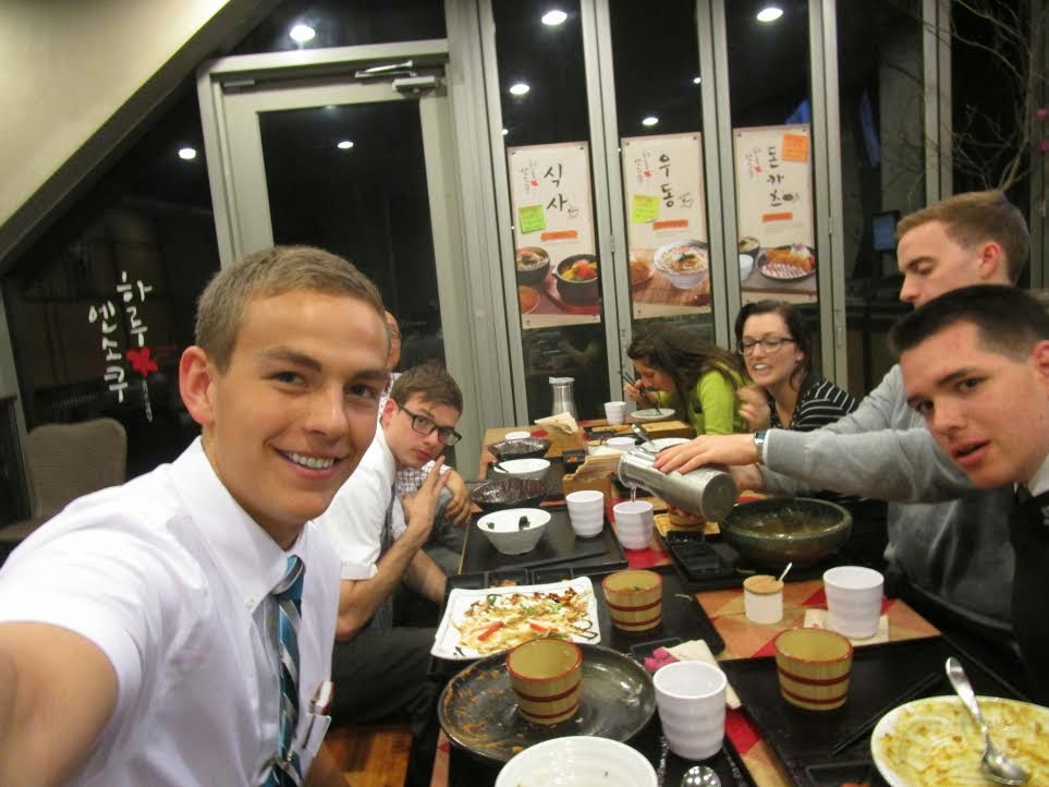 The good shall have everlasting life, so be good! This is one of my new motto's, it is a good one. All we need to do is be good and we receive everlasting life that sounds like a pretty good deal to me! Saturday was an amazing day and I had a really cool experience. I was teaching the advanced class and when we split off into groups to do the role play activity I was with Mr. Chan and Mr. Yong. They both spoke English very well and after our role play they both just started asking questions about the Church and what Mormons believe. I was all by myself because my companion was across the room so I had to think and answer fast. Lucky for me the spirit definitely was there and helped me answer their questions. After class Mr. Yong still had questions so my companion and I took him into the other room where it was more quiet to answer his questions. First off, it was a miracle that Mr. Yong even showed up! It was the first time he had been to English class and found out about it online! The question came up as to whether or not I was born into the Mormon church because he felt like most Mormons were. Then he asked if both my parents were born Mormon and I said no. At that time I had the amazing opportunity to share with him Dad's conversion story. The spirit was so strong in the room and Mr. Yong had to of felt it!! I got choked up at the end because if it weren't for my mom and her example to my Dad of the joy the gospel can bring to your life and my Dad's desire to find out for himself if the Book of Mormon were true. He would of probably not married my mom or got converted to the Church of Jesus Christ of Latter Day Saints and I wouldn't have the amazing family I do now or even be on a mission right now. At that very moment I realized how important it was that I make them proud and be the great missionary they raised me to be. For dinner a member, Takiyama, took us to a Japanese restaurant after we practice taught him a lesson.